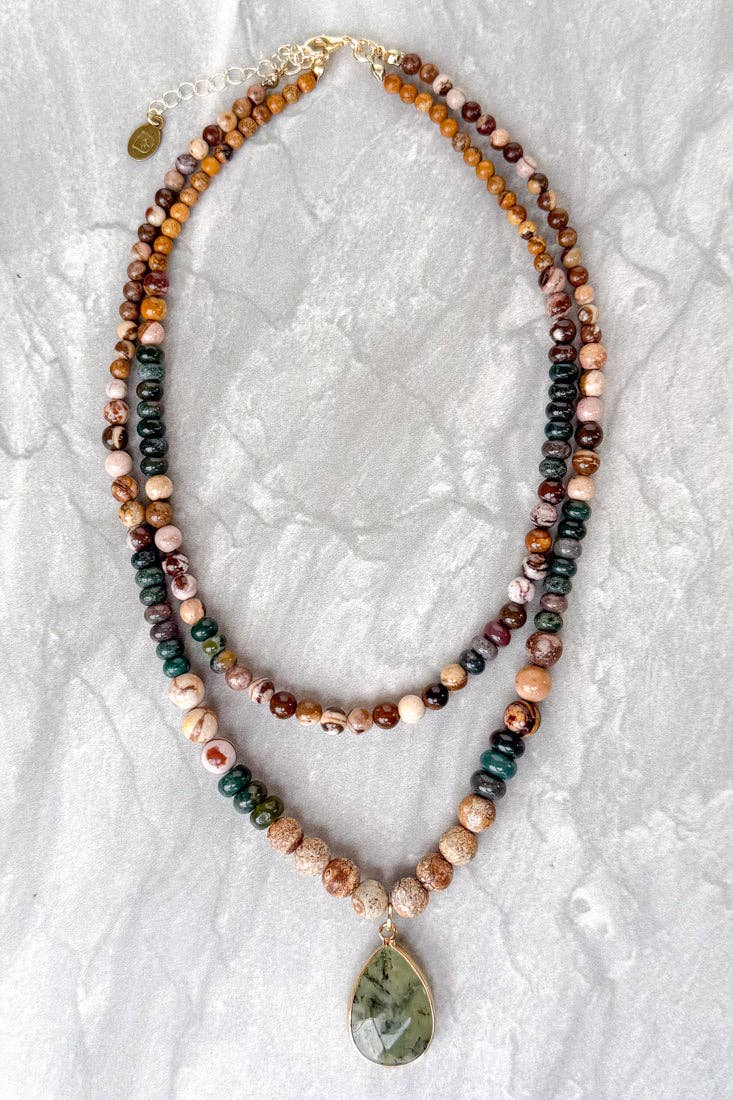 Beautiful double strand beaded necklace with stone beads and green jasper stone pendant.