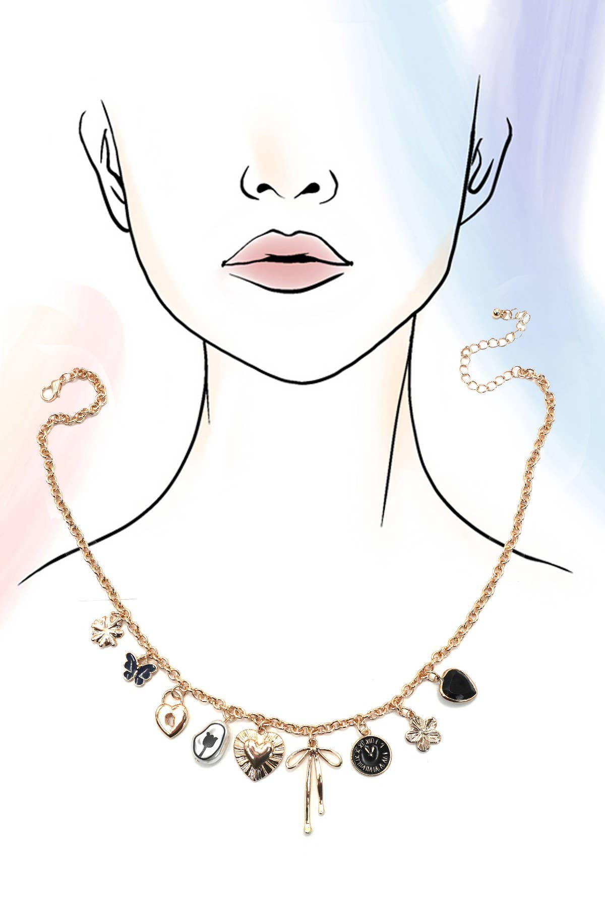 CHARM NECKLACE-HEART CLOCK BOW LOCK CHARMS | 80N91815: GOLD