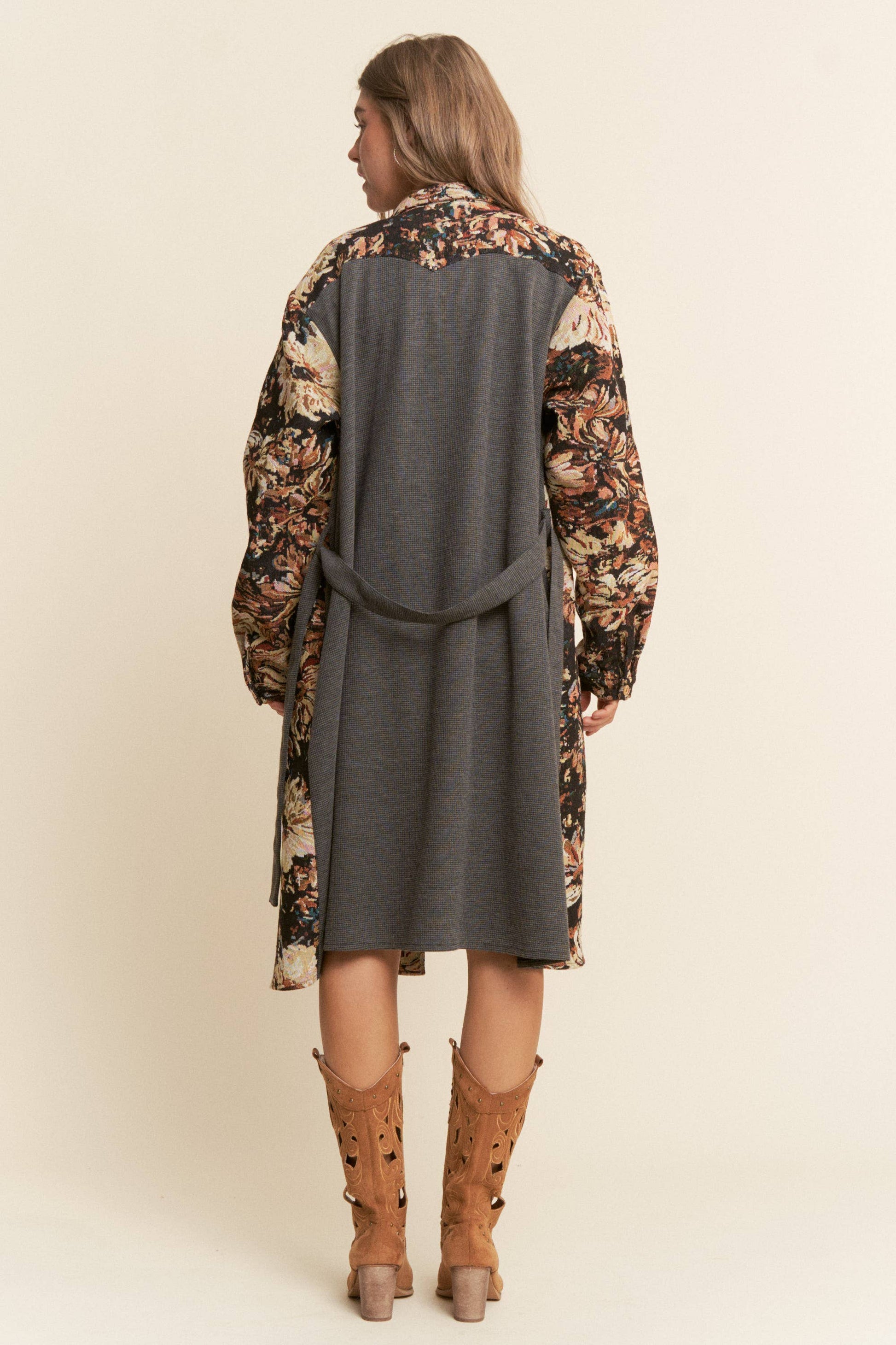 Women's vintage floral pattern knit button down light wear coat with waist tie strap. Coat has a baby waffle solid color color contrast on the back that matches the waist belt. Below the knee length.