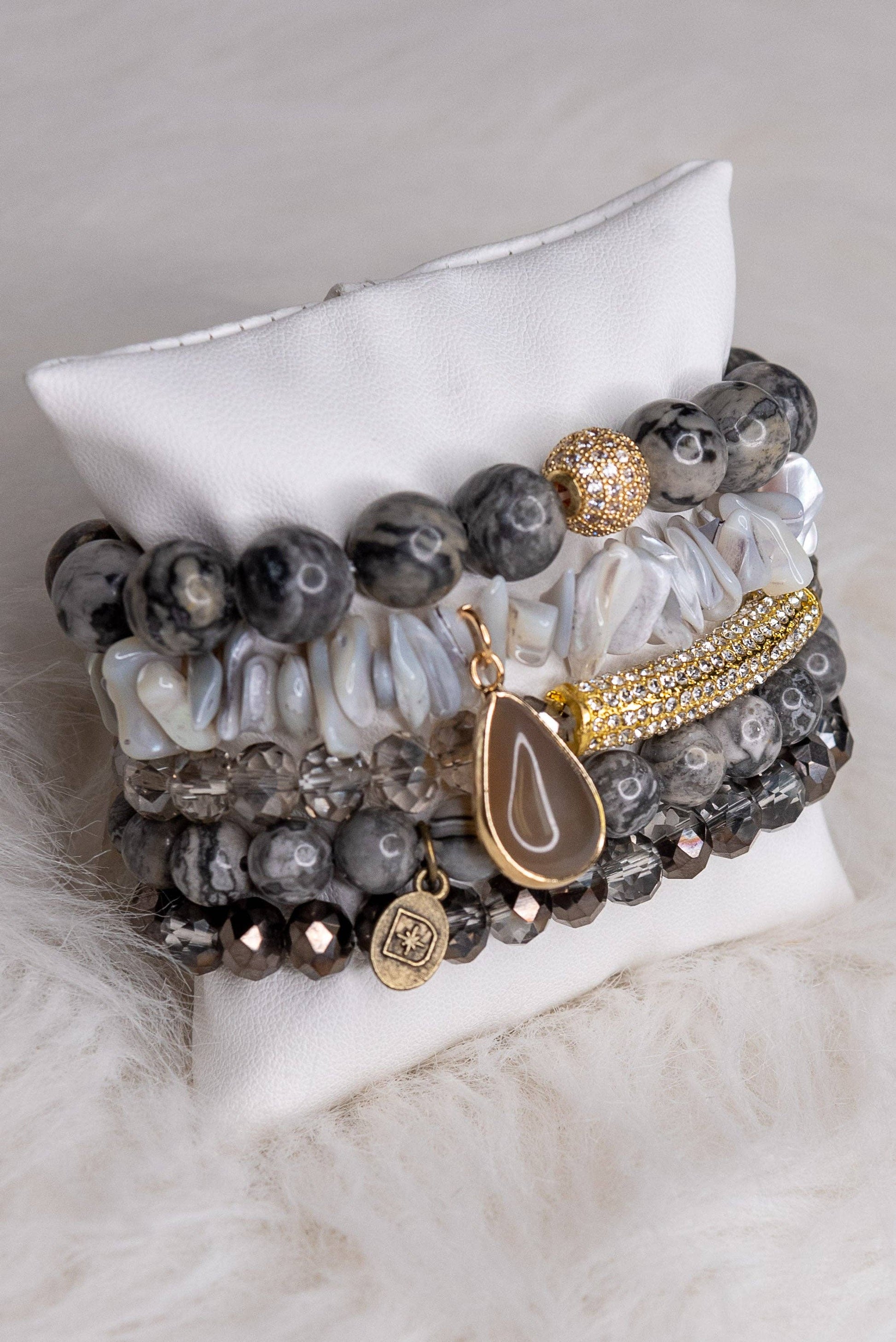 5 beautiful natural stone and beaded bracelets with stretch band. 3 have a unique druse charm. Can be worn together or separately.