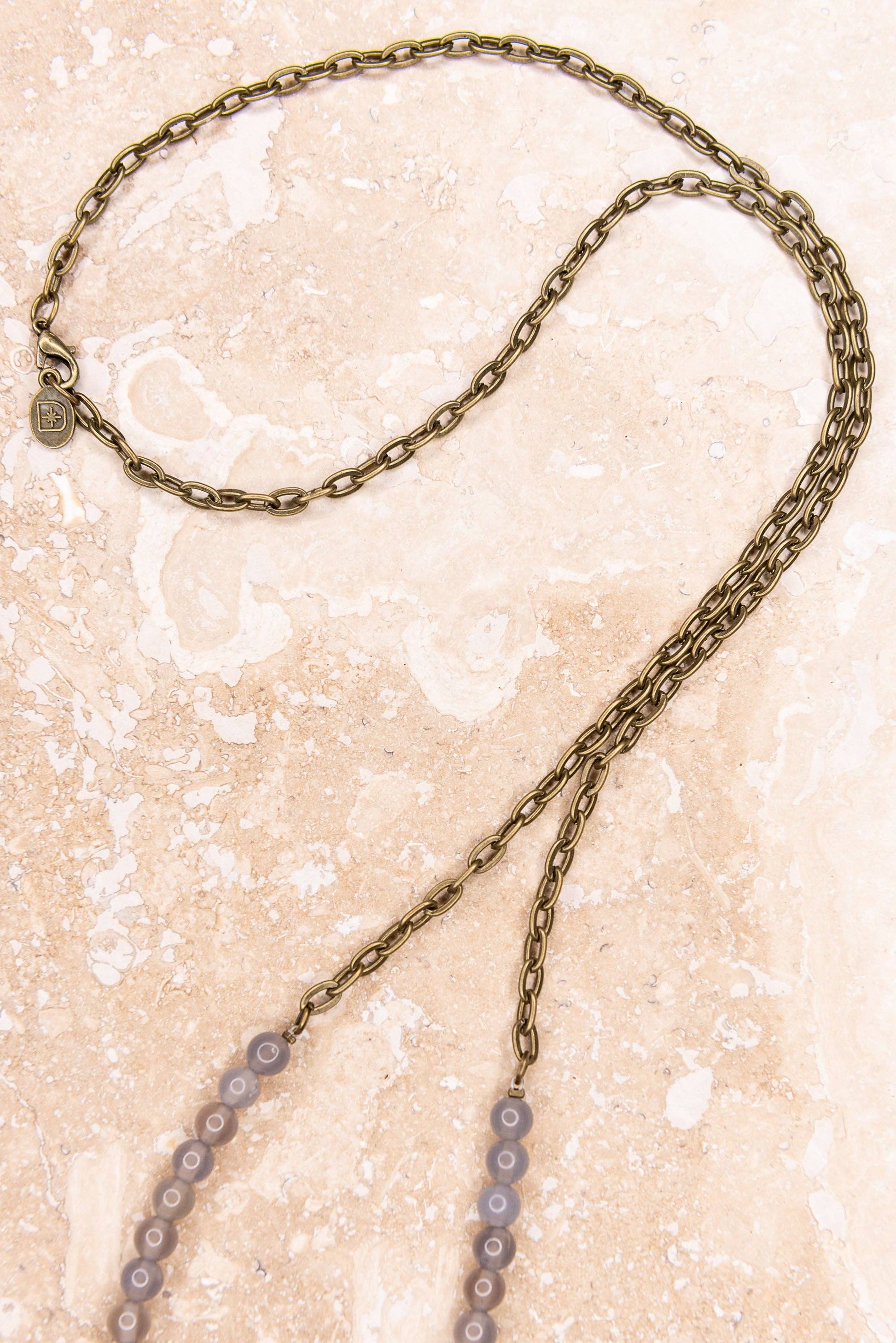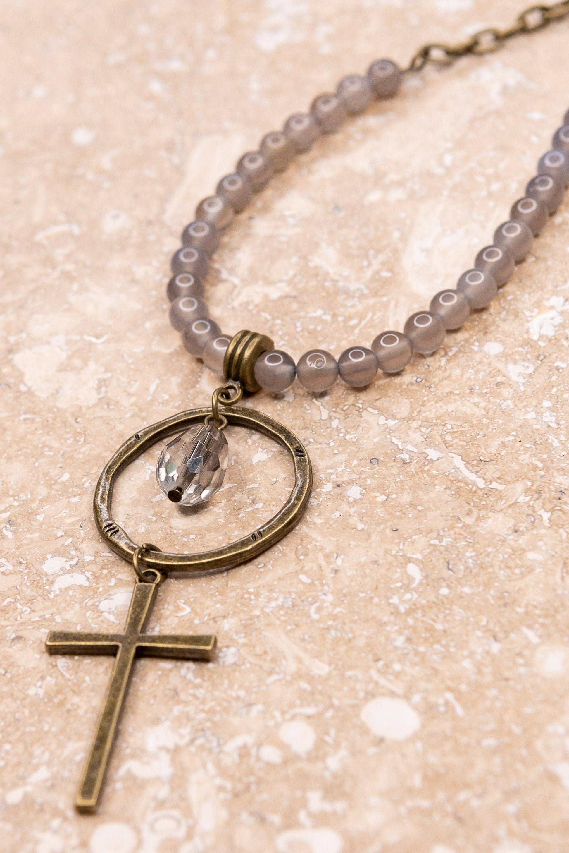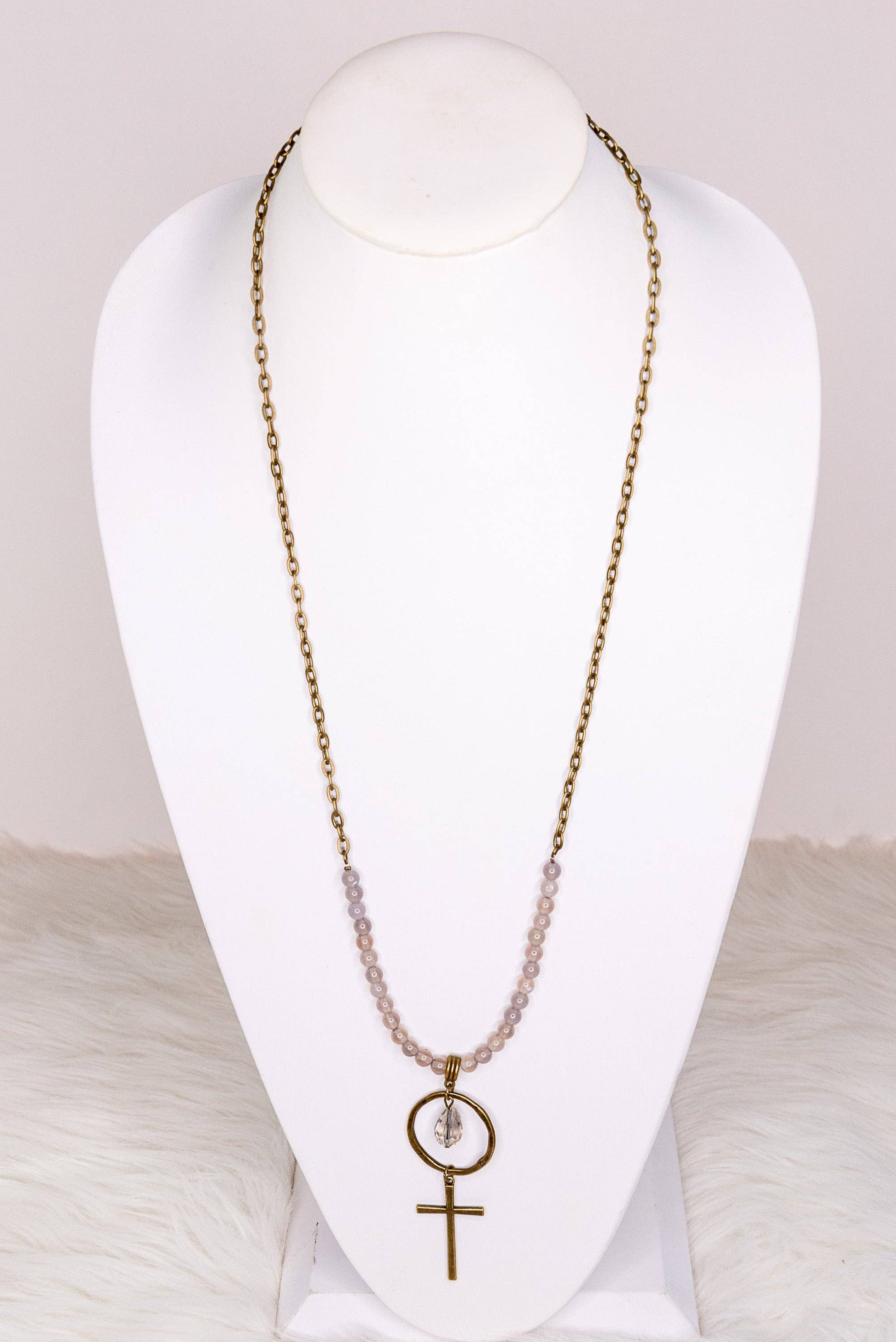 Skinny chain link necklace with natural stone beads on bottom half. The pendant is made up of a bronze hoop with a crystal bead and cross charm. This necklace has a lobster claw closure.