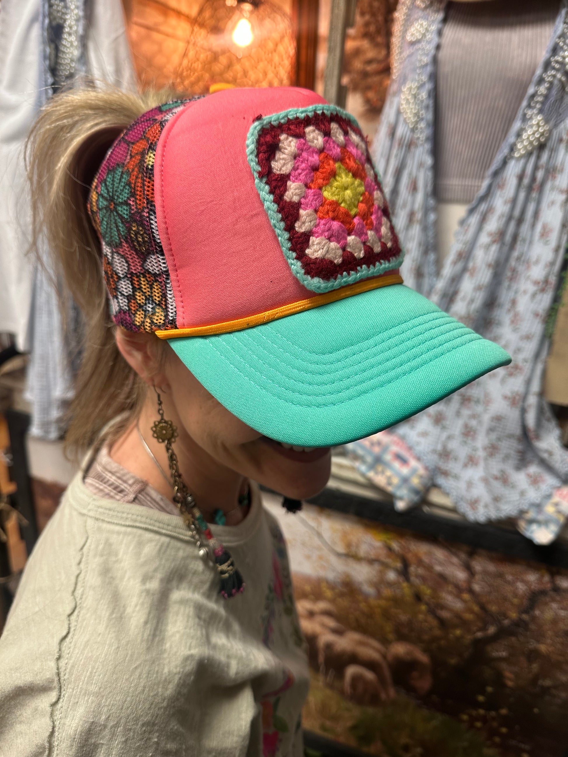 Add a splash of fun to your look with the Granny Square Hat. This hot pink and green trucker hat features retro floral mesh sides that bring a playful vintage vibe. Adjustable for a comfy fit, it’s perfect for brightening up any casual outfit with a pop of color and charm.