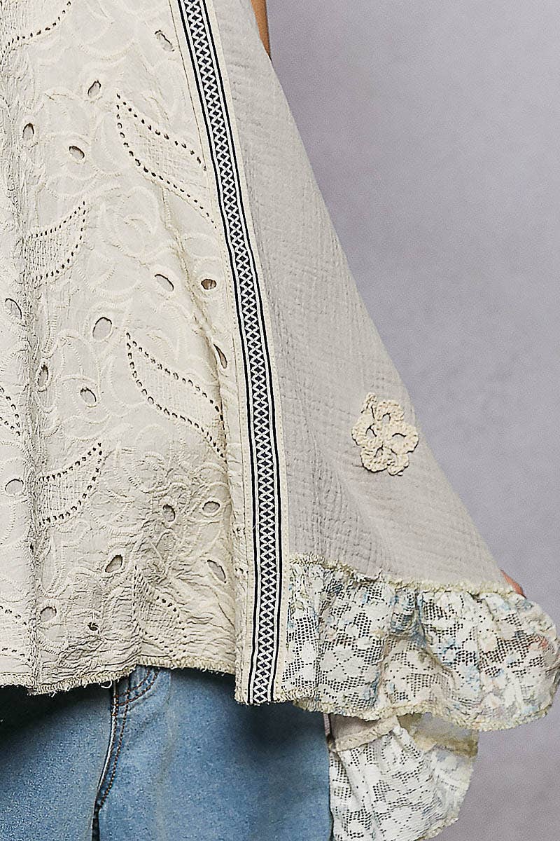 Designed in halter neck sleeveless regular fit top in double gauze with crochet patch, elastic back band, lace ruffle, vintage washing, solid color.