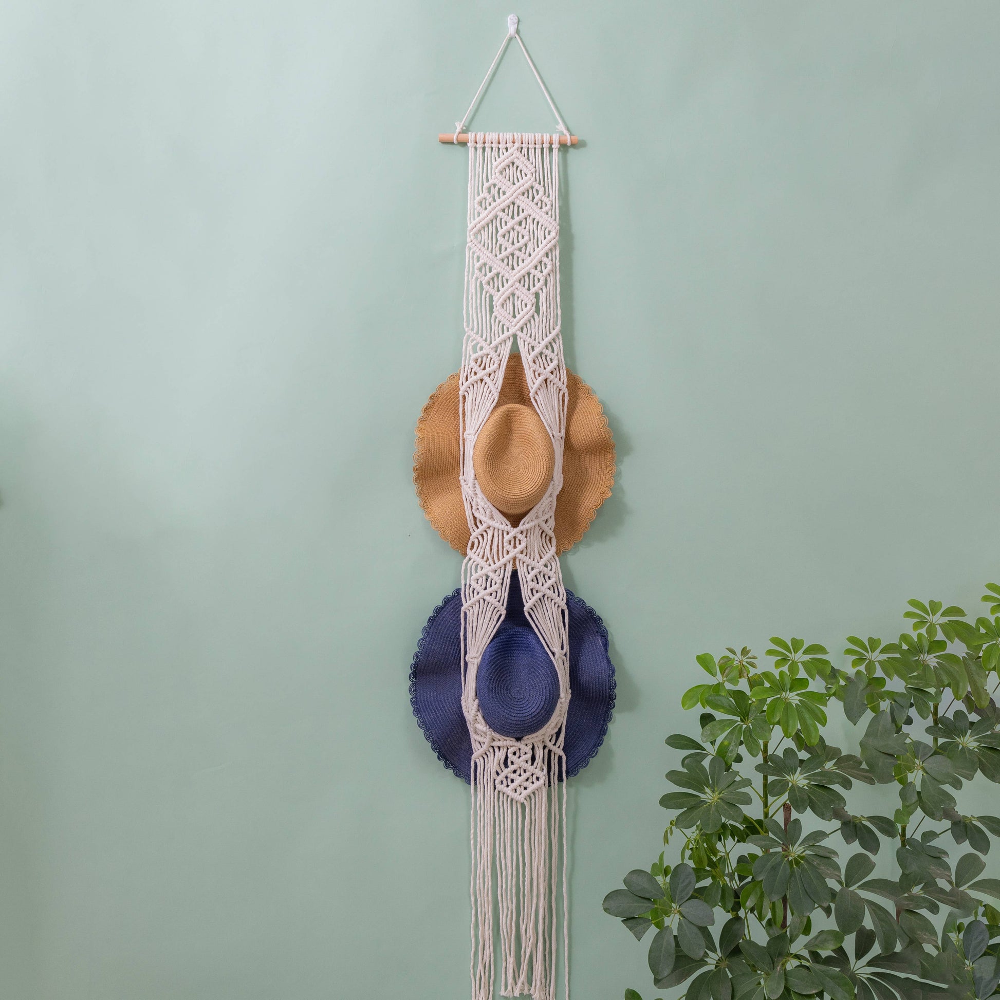 This Handmade Macrame Wide Brim Hat Hanger is a stylish and practical solution for organizing your hat collection. Crafted with care, this wall-mounted hat display rack features intricate macrame knots that add a touch of bohemian charm to any space.