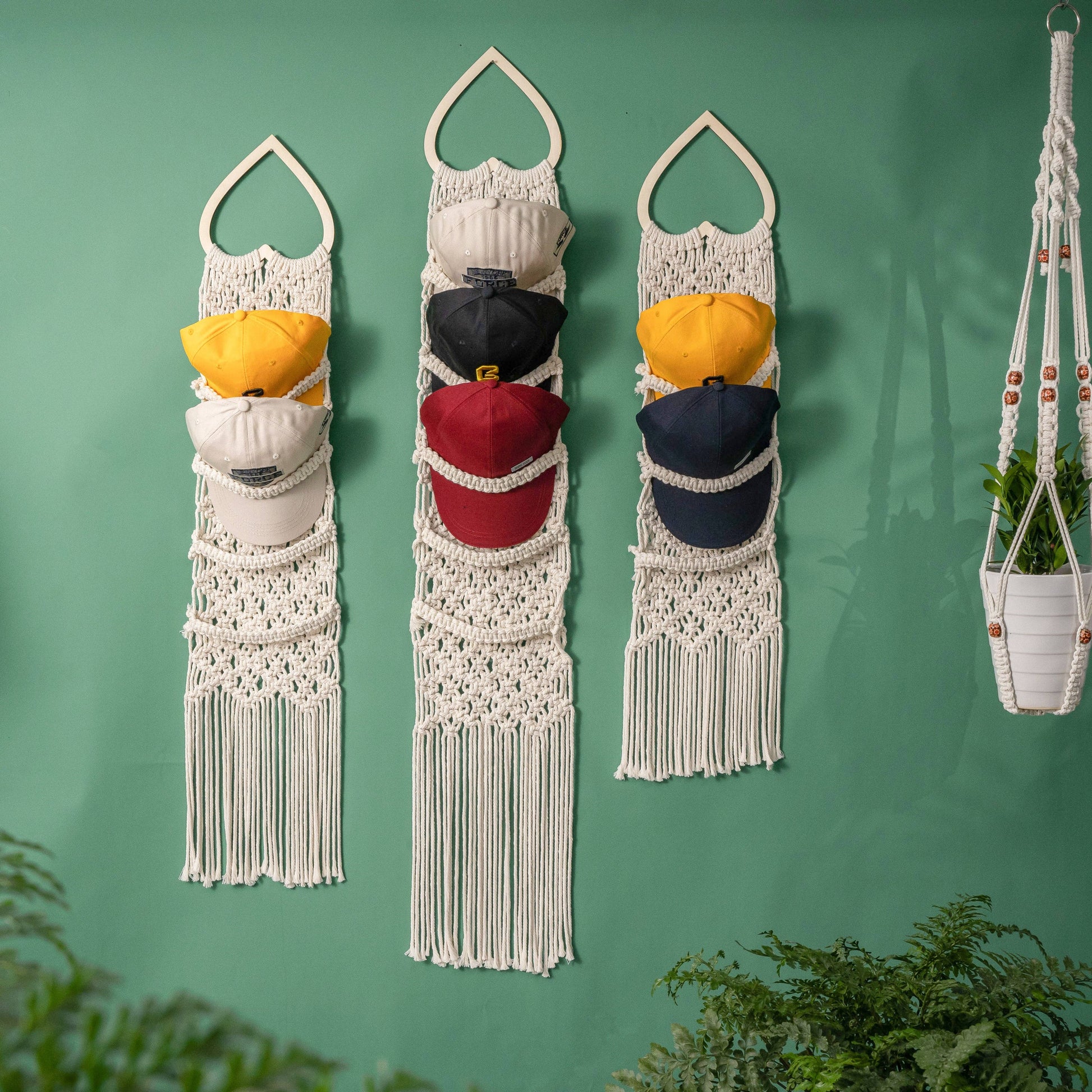 This Handmade Macrame Baseball Cap Hanger is a stylish and practical solution for organizing your hat collection. Crafted with care, this wall-mounted hat display rack features intricate macrame knots that add a touch of bohemian charm to any space.
