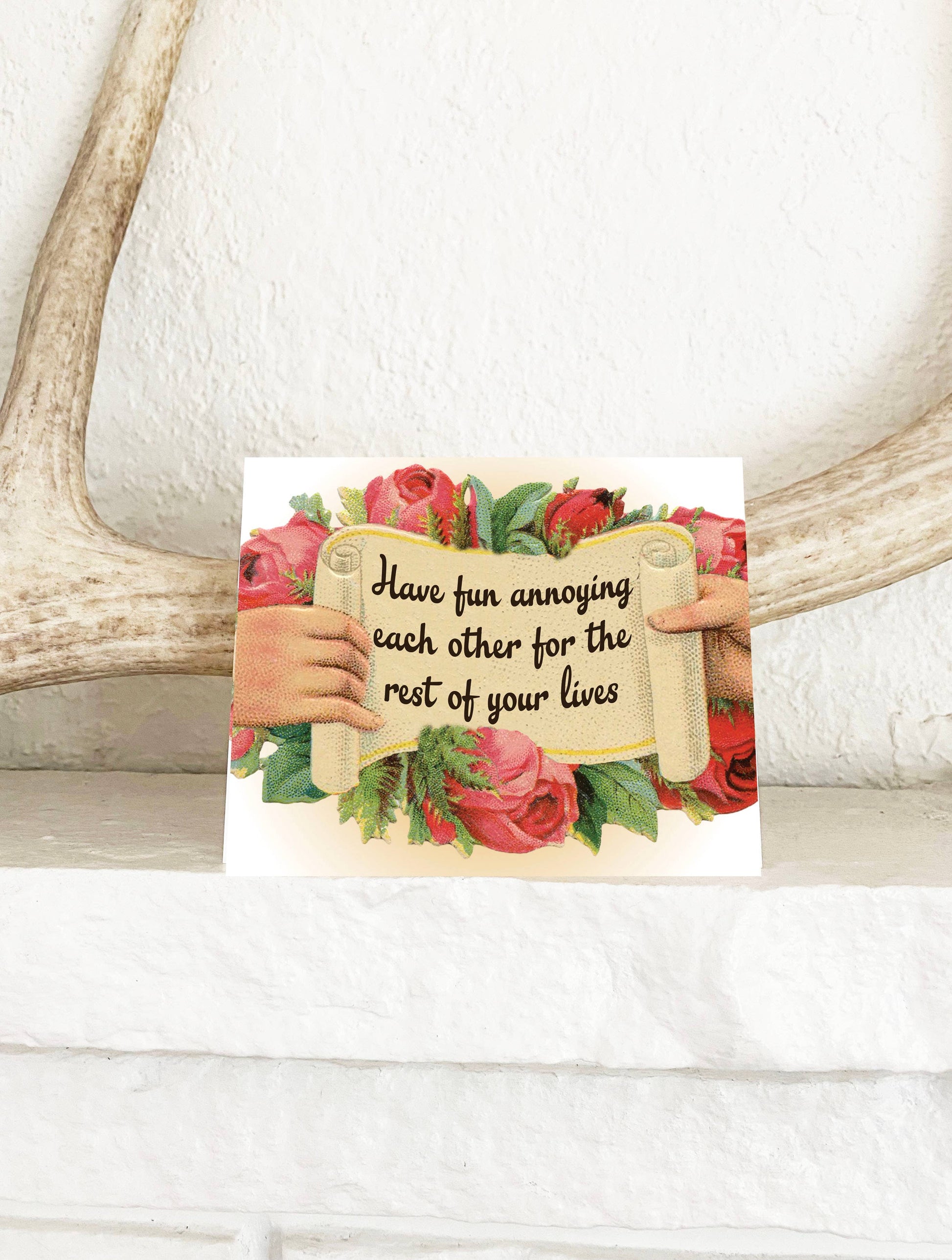 Printed on fine 130lb paper this card is perfect for newlyweds and anniversaries and couples who just moved in together because no matter how much you love someone they'll still annoy you at some point and that's ok. Blank inside and comes with an envelope and a protective cello bag. So cute you could even frame it! Size A2 card measures 4.25"x5.5"