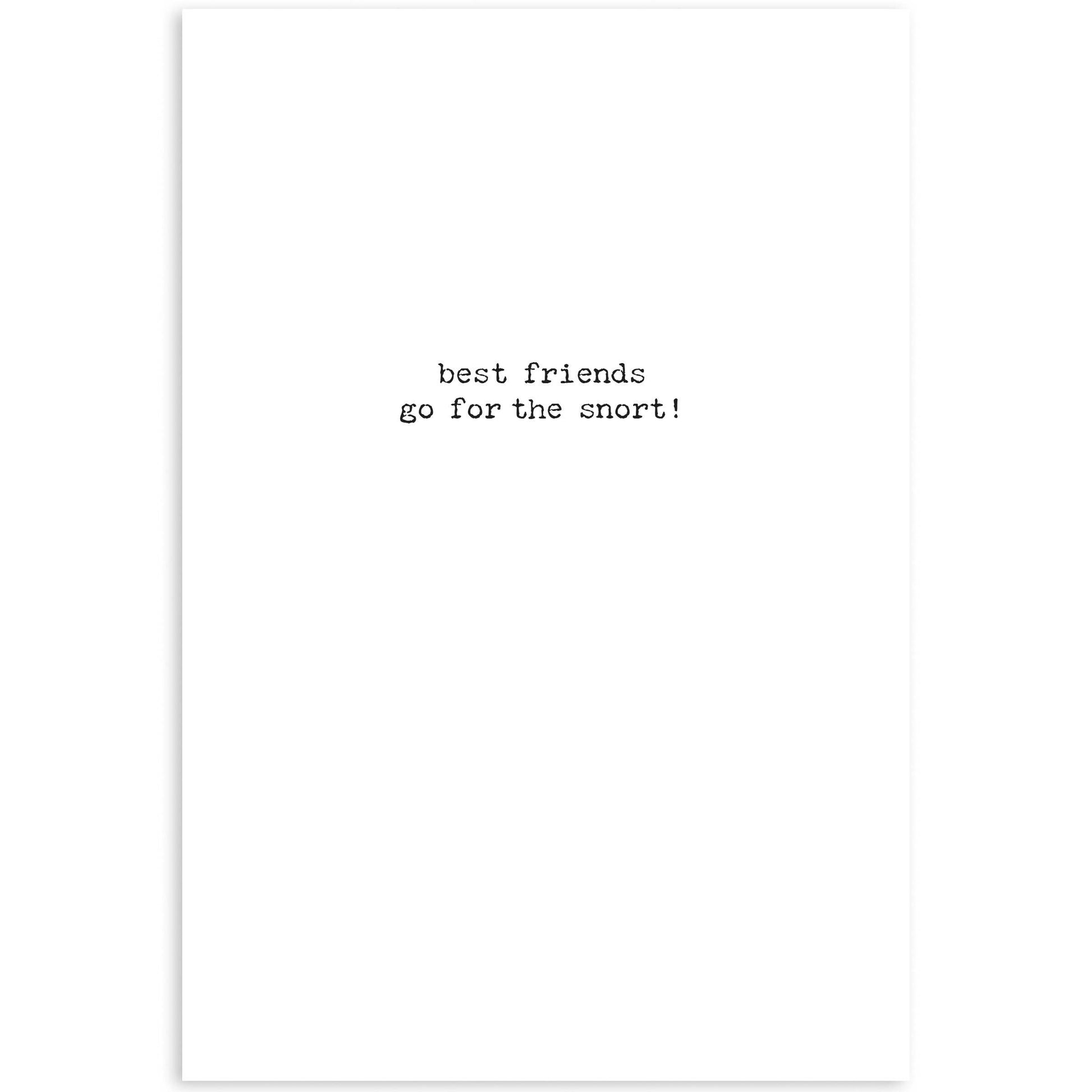 A greeting card from our Trash Talk By Annie Collection displaying a fun vintage black and white photograph complemented with a humorous friendship inspired sentiment. Greeting card features "Good Friends Make Each Other Laugh..." sentiment on the outside and "Best Friends Go For The Snort!" sentiment on the inside with space to add a personalized message. Our Laugh greeting card is a hilarious gifting option for everyday moments. Proudly made in the USA.