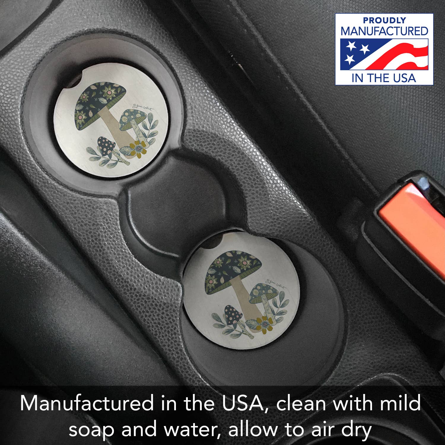 Manufactured in the USA of absorbent stone to absorb excess condensation from beverages. Assists to keep your car's cup holder clean and dry. Convenient notch on side of the car coaster, makes it easy to remove while detailing your car. Beautiful artwork adds distinction to your vehicle’s interior. Clean the coaster by wiping clean with damp cloth and mild detergent. Measures 2.6 inches round and fits most vehicle cup holders. Find that special design to complete your vehicle's personality. Family and Friends will love receiving these long lasting, attractive Coasters for any occasion of the year. Comes in Polybag with Hang Tab.