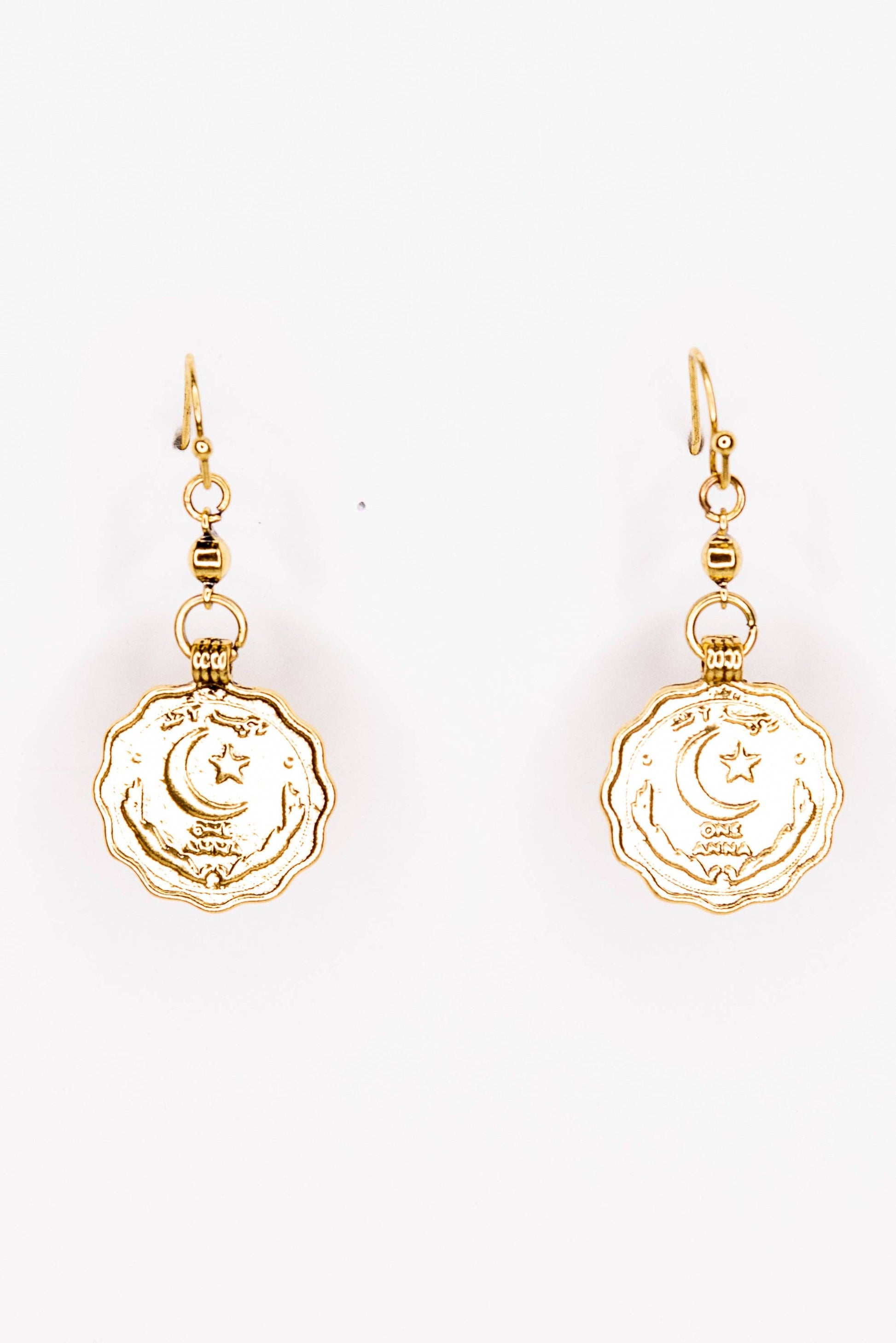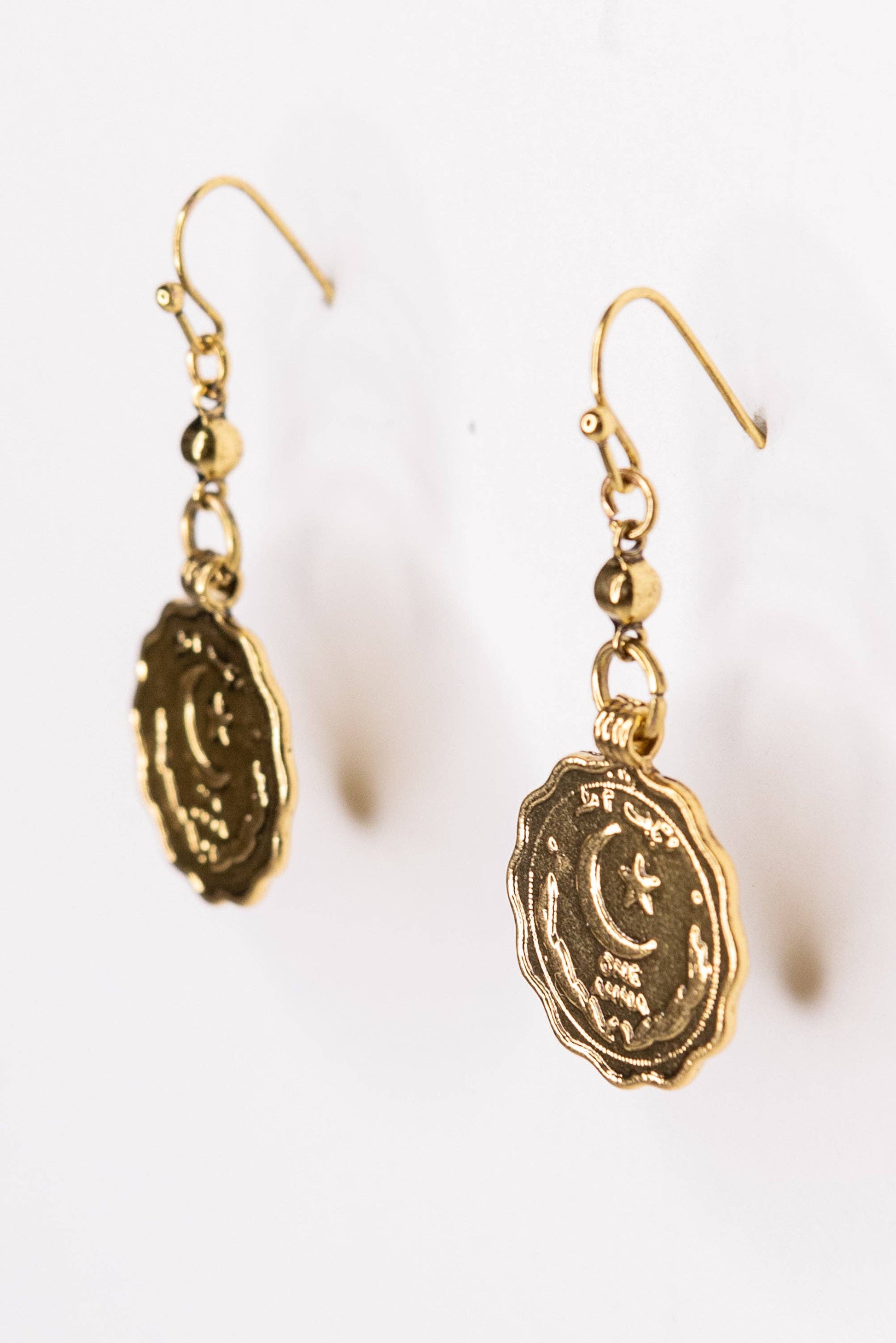 Lightweight fishhook earrings with with a two sided, scalloped coin pendant.