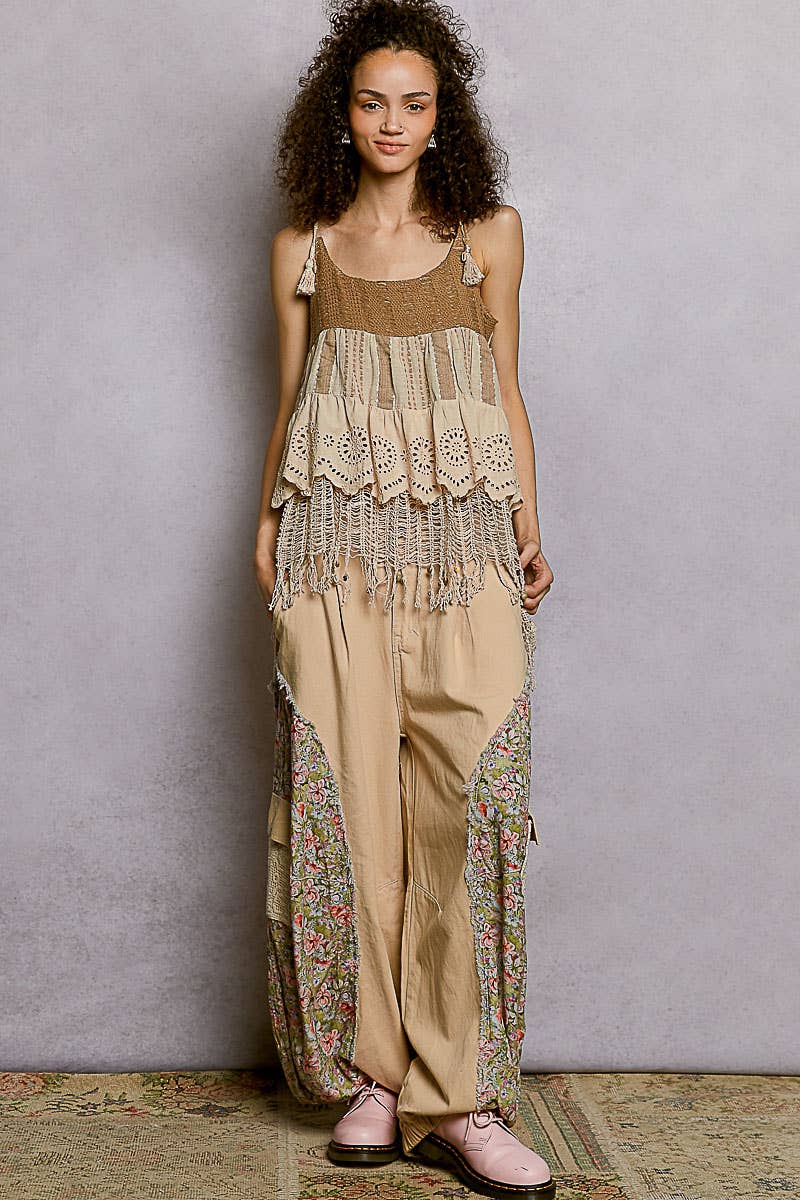 Square Neck Sleeveless Crochet Patch Plaid Eyelet Cotton Top
