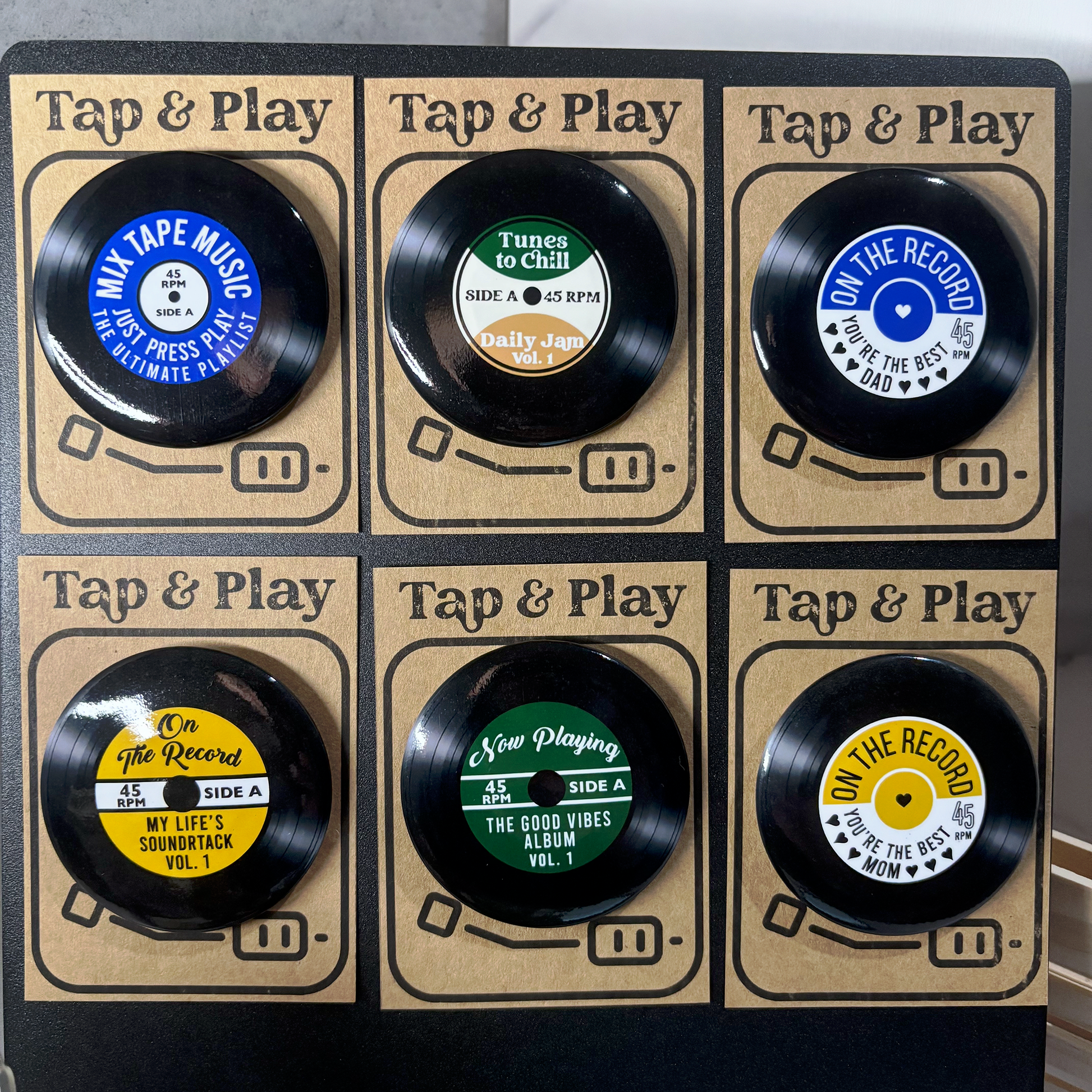 Looking for a fun, personal, and unique gift? Meet Tap & Play – our vinyl record-themed NFC magnets that let you share a vibe with just a tap. What It Does:Each magnet has a hidden NFC chip inside. Just tap your phone on the center of the record and it will instantly open a YouTube video, Spotify song, custom playlist, or any link you choose. Perfect for artists, gift-givers, and music lovers. Use it for: -Sharing your own music, art, or video with friends and fans -A cute way to send a song to someone special -A creative way to say “Happy Mother's Day”, “You’re the Best Dad,” or “I love you” -Promoting your content with a tap-to-play music Great gift for: Boyfriends • Girlfriends • Moms • Dads • Music Lovers • Creatives • Friends How It Works: - Tap your phone on the center of the magnet or keychain - Wait 2–3 seconds for the NFC link to pop up Instructions on how to add your Spotify, YouTube, or any custom link will be included with your purchase