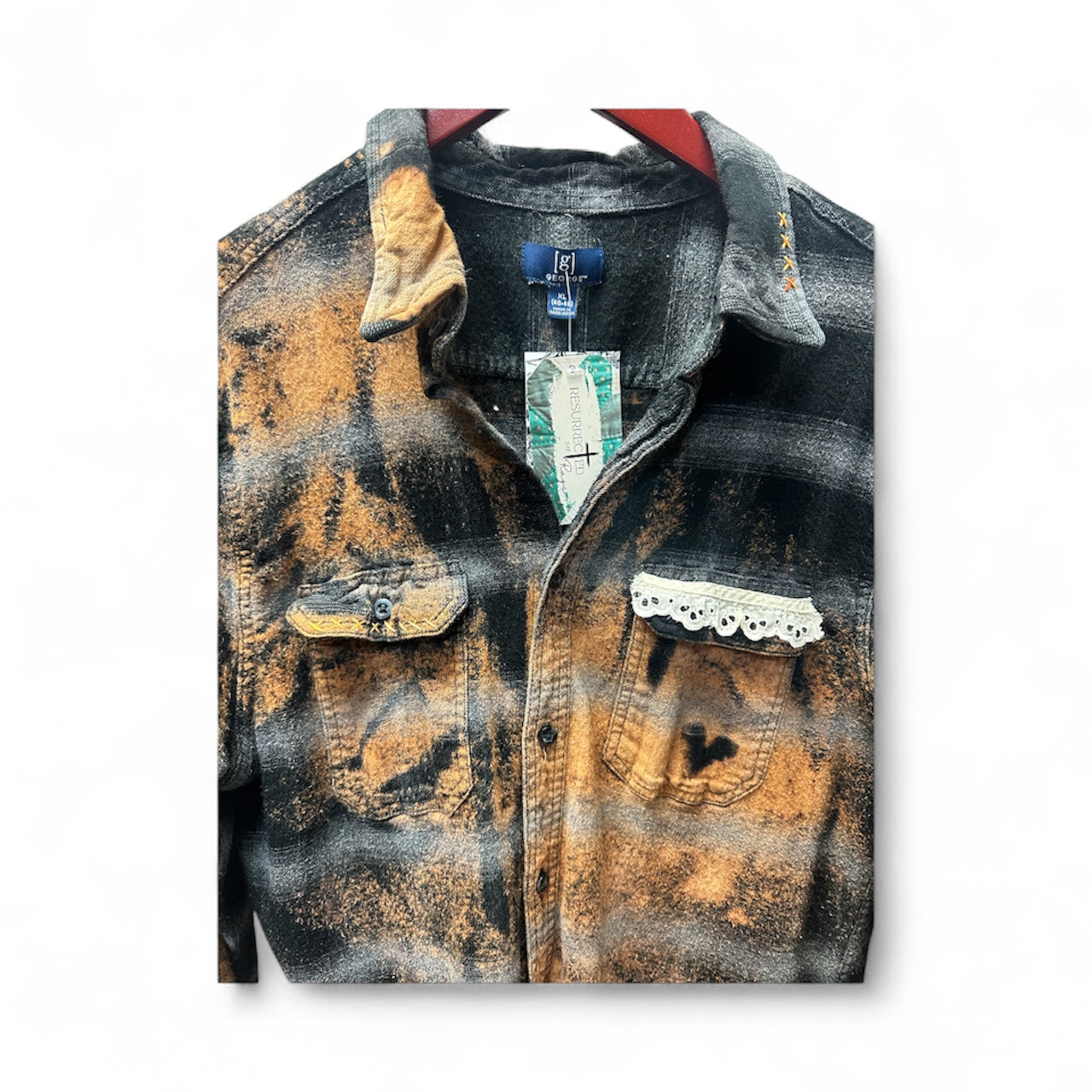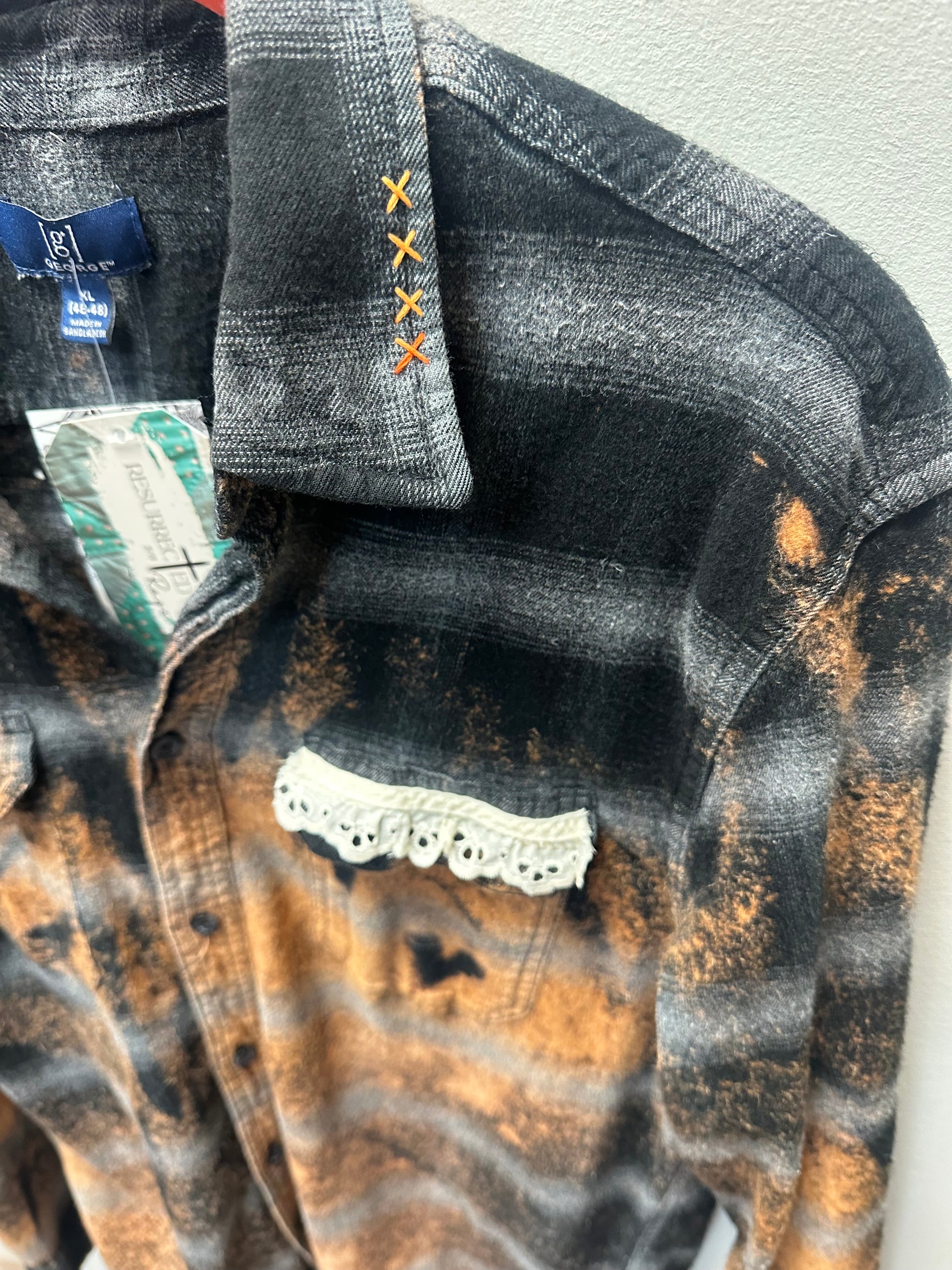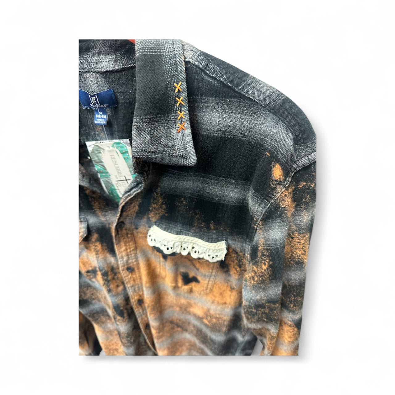 Our creations are more than just garments; they are stories woven from the fabric of history, each with a unique past and a vibrant new life. Handcrafted with care, no two creations are alike, ensuring that each piece you wear is truly one-of-a-kind. In our quest to breathe new life into these textiles, we incorporate vintage quilts and delicate doilies, turning forgotten treasures into cherished fashion statements. Embrace these resurrected rags as a testament to renewal and transformation. Just as 2 Corinthians 5:17 reminds us, "Therefore, if anyone is in Christ, the new creation has come: The old has gone, the new is here!" May these flannels serve as a beautiful reminder of the possibility of rebirth and the beauty of embracing a new beginning.