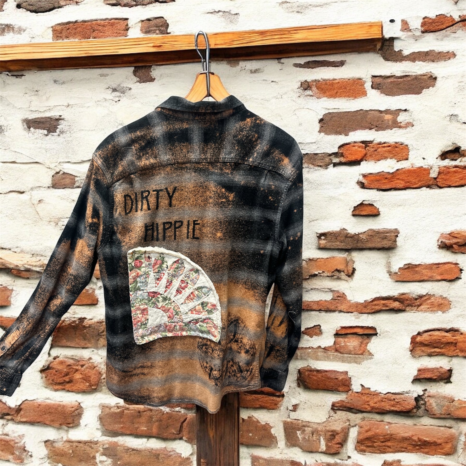 Each shirt is an upcycled mens flannel so they will run a little oversized. Every flannel is unique, some have holes and distressing from being worn others have appliques from antique quilts and vintage scraps of history.